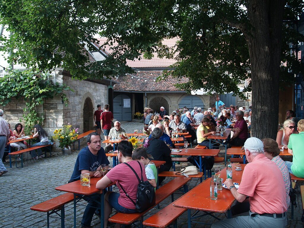 Sie sitzen in den historischen Mauern der Kirchenburg und genießen Musik, fränkische Spezialitäten, Hüttenheimer Weine und vielfältige Gastlichkeit.