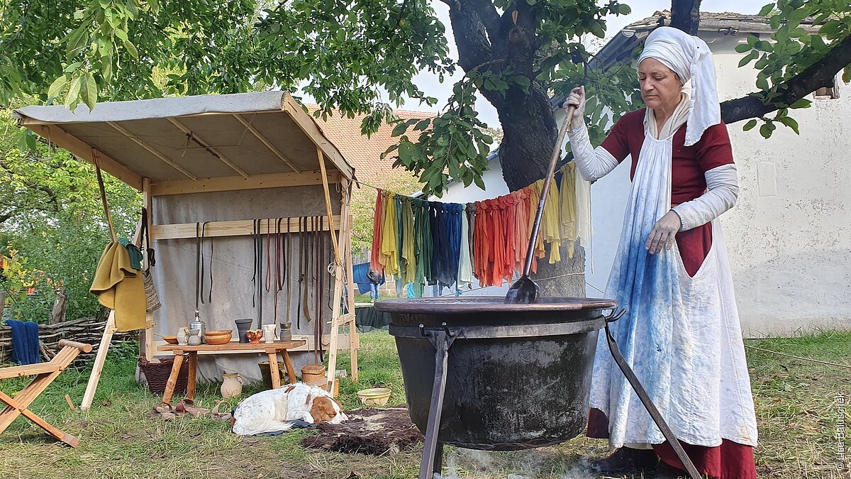 „Zu Gast bei den Patriziern“ heißt es in der Baugruppe Stadt bei den Mitgliedern der Gruppe „Civitas 14. Jahrhundert“. Während der Freitag im Zeichen der Vorbereitung eines großen Banketts steht, können sich Interessierte am Samstag ab etwa 16.00 Uhr einen Eindruck verschaffen, wie es so war, wenn ein reicher Kaufmann einen wichtigen Gast empfing. Am Sonntag wiederum heißt es ganz nüchtern „Nach dem Spektakel“, denn nach der großen Feier muss auch wieder aufgeräumt und geputzt werden. Die Kleidung im Mittelalter steht nach der Premiere im vergangenen Jahr erneut in Form von Modenschauen im Alten Bauhof im Fokus. An allen drei Mittelalter-Tagen ab 14.00 Uhr wird zum Beispiel erläutert, zu welcher Zeit die Männer Beinlinge trugen und welche Rolle die Haube nicht nur bei Frauen, sondern ebenso bei Männern hatte.